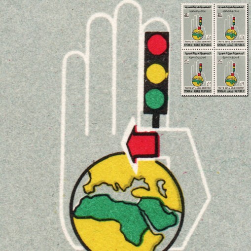 Na znaczku widnieją światła drogowe na kuli ziemskiej i dłoń.