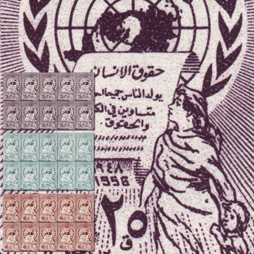 Seria we fragmentach arkuszy po dziesięć znaczków upamiętniająca 10. rocznicę uchwalenia powszechnej deklaracji praw człowieka.