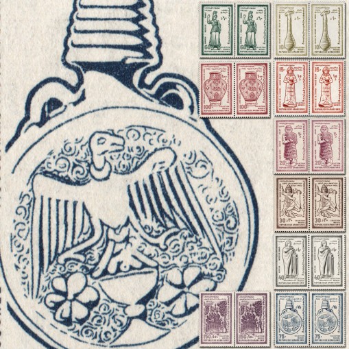 Na znaczkach widnieją kolejno: obrzędowa grzechotka z brązu, babilońska figurka bogini wiosny, figurka króla z Mari, bóg słońca Mitra walczący z bykiem, grecka figura Aspazji, rzymska figura Minerwy, szklana butelka, emaliowana waza, mozaika z Wielkiego Meczetu w Damaszku.