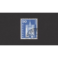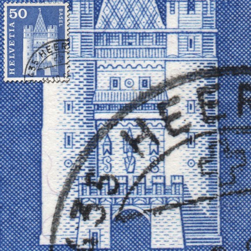 Kasowany znaczek, na którym widnieje brama Spalentor w Bazylei.