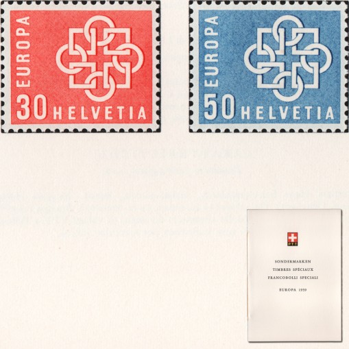 Walory tej emisji mają rozpoznawalny wśród filatelistów motyw breloczka, będący projektem niemieckiego grafika (Walter Brudi). Na znaczkach ze Szwajcarii widzimy sczepiające się 4 kwadraty i 4 kółeczka, które miały symbolizować współpracę pomiędzy zrzeszonymi krajami europejskimi (w 1959 do sześciu zrzeszonych krajów dołączyły Szwajcaria oraz Austria).