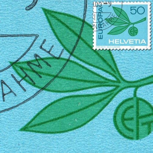Kasowany znaczek z emisji EUROPA CEPT z 1964 roku, która miała rozpoznawalny wśród filatelistów projekt kwitnącej gałązki drzewa autorstwa islandzkiego grafika (Hördur Karlsson). Gałązka miała 3 listki symbolizujące list, telegraf i telefon, oraz owoc złożony z liter CEPT.