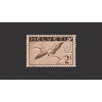 Znaczek poczty lotniczej przedstawiający gołębia pocztowego z listem w dziobie.