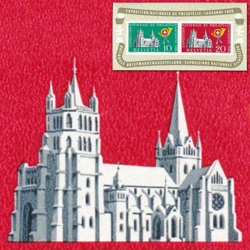 Na znaczkach widnieje katedra w Lozannie i róg pocztowy.