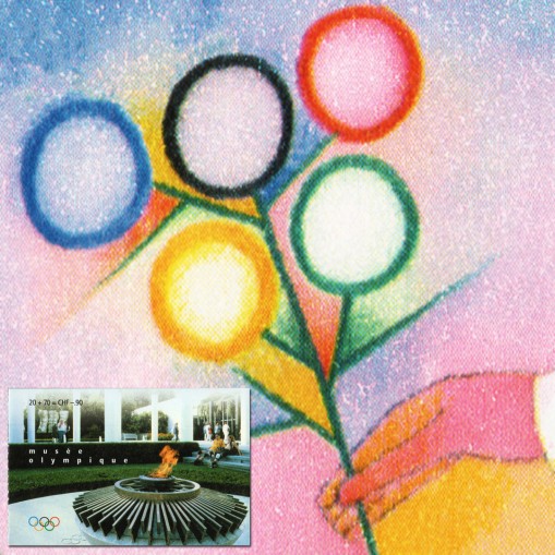 Na znaczkach widnieje kwiat z pierścieniami olimpijskimi zamiast pączków.