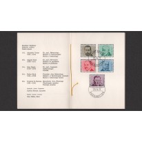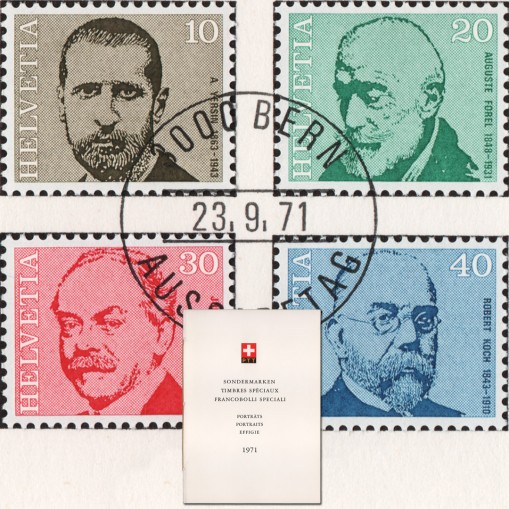 Kasowane grzecznościowo znaczki w folderze prezentacyjnym pierwszego dnia obiegu. Na znaczkach widnieją słynni lekarze, kolejno: