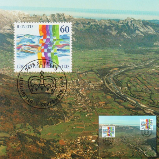 Podwójny znaczek na karcie maksimum celebrujący kooperację sąsiadujących ze sobą Liechtensteinu i Szwajcarii.