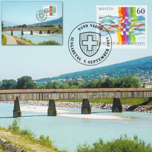 Znaczek na karcie maksimum celebrujący kooperację sąsiadujących ze sobą Liechtensteinu i Szwajcarii.