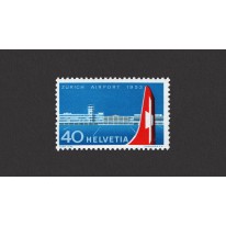 Na znaczku widnieje ogon samolotu linii Swissair i budynek lotniska.
