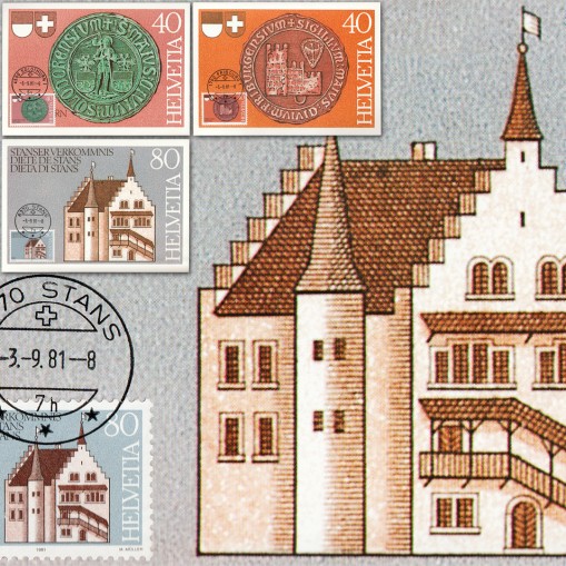 Znaczki upamiętniające 500-lecie traktatu spisanego w mieście Stans w 1481 roku (niem. Stanser Verkommnis), który zażegnał konflikt między szwajcarskimi kantonami Solothurn, Freiburg i Stans, zapobiegając tym samym rozpadowi konfederacji szwajcarskiej i umożliwiając jej rozszerzenie na kolejne 5 kantonów w następnych dziesięcioleciach.