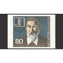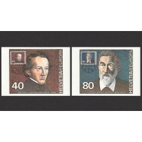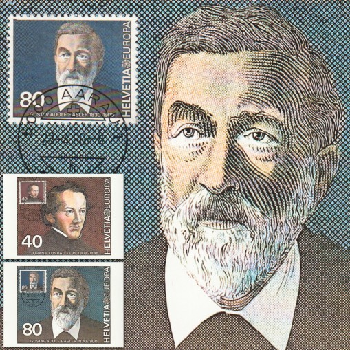 Na znaczkach i kartach widnieją kolejno: polityk Johann Conrad Kern i wynalazca Gustav Adolf Hasler.