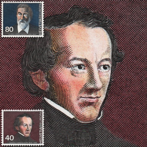Na znaczkach widnieją polityk Johann Conrad Kern i wynalazca Gustav Adolf Hasler.