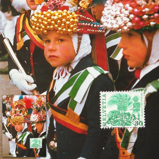 Znaczki na karcie maksimum, na którym przedstawiono lokalną tradycję z miejscowości Altastätten, gdzie podczas karnawału mężczyźni zwani Röllelibutzen przywdziewają kolorowe czapki oraz pasek z dzwonkami i spryskują przechodniów wodą.