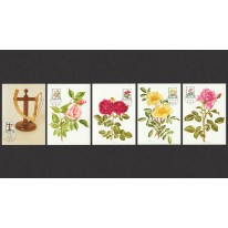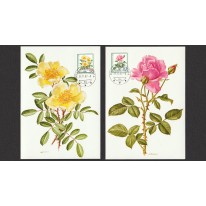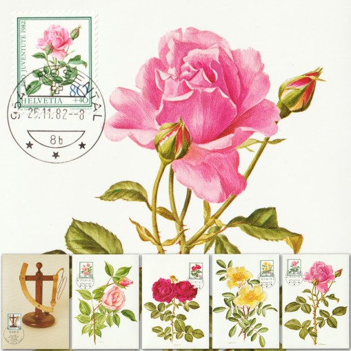 Znaczki na kartach maksimum, na których widnieją: stara waga pocztowa i odmiany róż ("La Belle Portugaise", "High Dickson", "Mermaid", "Madame Caroline").
