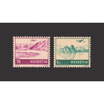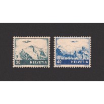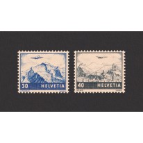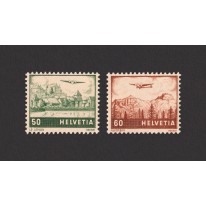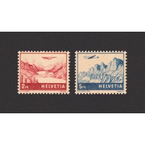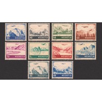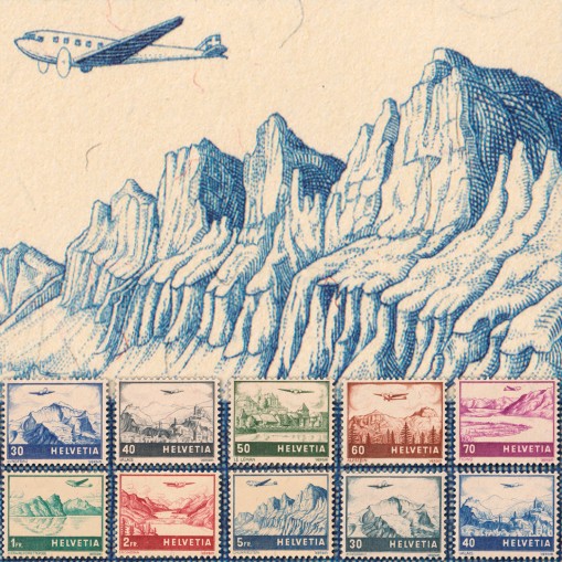 Na znaczkach widnieje samolot Douglas DC-2 ponad alpejskimi krajobrazami, kolejno: masywem Jungfrau, górami w kantonie Valais, Jeziorem Genewskim, szczytem Alpstein, górami w kantonie Ticino, Jeziorem Czterech Kantonów, jeziorami Gryzonii Górnej oraz szczytem Churfirsten.