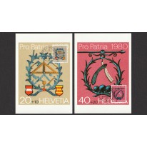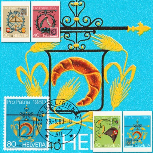 Znaczki na kartach maksimum z emisji Pro Patria, na których widnieją tradycyjne szyldy murarza, fryzjera, kapelusznika i piekarza.