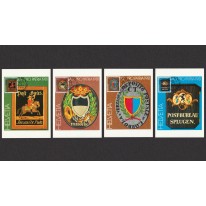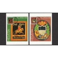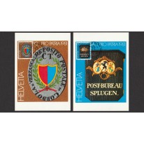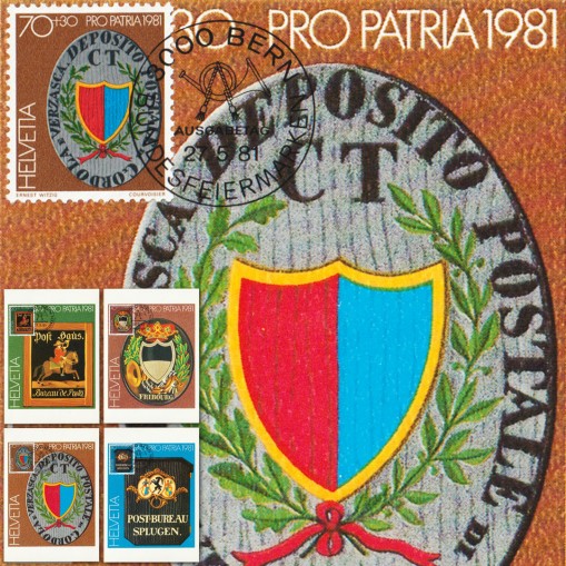 Znaczki na kartach maksimum z emisji Pro Patria, na których widnieją tradycyjne szyldy pocztowe z czterech szwajcarskich miast: Aarburga, Freiburga, Gordoli i Splügen.