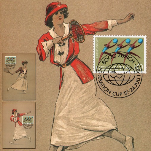Znaczek z 1971 roku na dwóch kartach maksimum upamiętniających tenisowe rozgrywki kobiet o Puchar Federacji, które miały miejsce w Zurychu w 1983 roku.