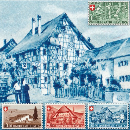 Na znaczkach widnieją tkacze w fabryce jedwabiu oraz tradycyjne domy wiejskie z rejonów Jury i doliny rzeki Emmen oraz drewniany dom ze wschodniej Szwajcarii.