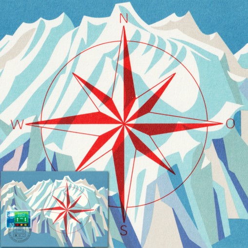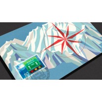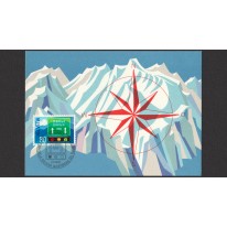 Na znaczku widnieje sygnalizacja świetlna i znaki drogowe, na karcie natomiast przedstawiono masyw górski.