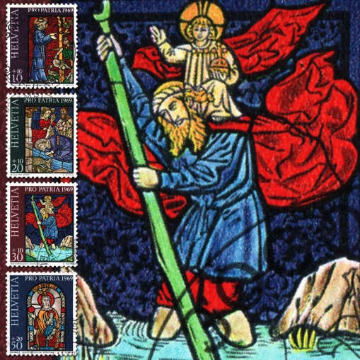 Na znaczkach widnieją witraże z różnych szwajcarskich kościołów przedstawiające kolejno: świętego Franciszka z Asyżu, lud Izraela, świętego Krzysztofa i Madonnę z Dzieciątkiem.