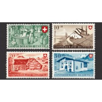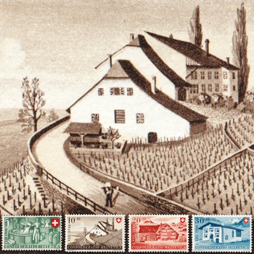 Na znaczkach widnieją pracownicy przy wyrobie sera oraz tradycyjne domy wiejskie z kantonów Vaud, Appenzell i Gryzonii.
