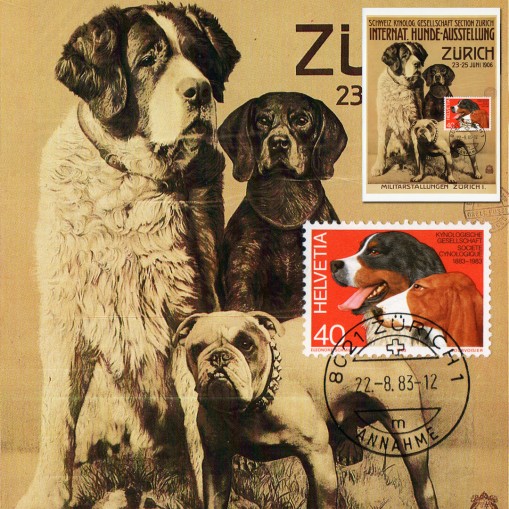 Na znaczku widnieją dwie rasy psów: berneński pies pasterski i pies gończy ze Schwyz. Na karcie przedstawiono plakat z 1906 roku reklamujący międzynarodową wystawę psów w Zurychu.
