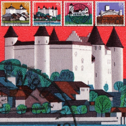 Kasowane znaczki z cyklu Pro Patria („na rzecz ojczyzny”). Znaczki te wydawano corocznie na szwajcarskie święto narodowe obchodzone 1. sierpnia. Część dochodów ze sprzedaży tych walorów (nominały mają dopłatę) była przeznaczona na promocję kultury i projektów społecznych.