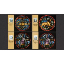 Na kartach widnieją witraże przedstawiające znaki zodiaku.