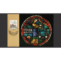 Znaczki obiegowe wydane w 1985 roku na kartach maksimum przedstawiające znaki zodiaku i szwajcarskie wsie, kolejno: