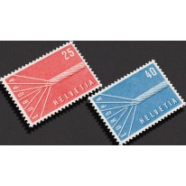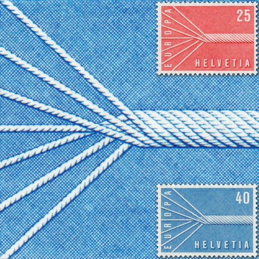 Na znaczkach szwajcarskich widnieje stalowa lina strunowa skręcona z 7 drutów, reprezentujących 6 państw członkowskich, które podpisały traktaty rzymskie i 7 kraj do nich dołączający, czyli Szwajcarię.