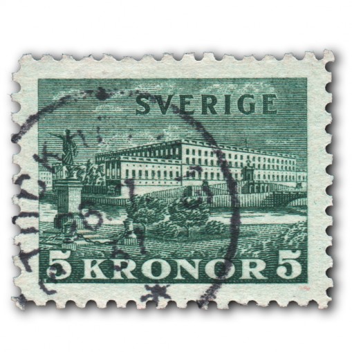 Kasowany znaczek, na którym przedstawiono pałac królewski w Sztokholmie.