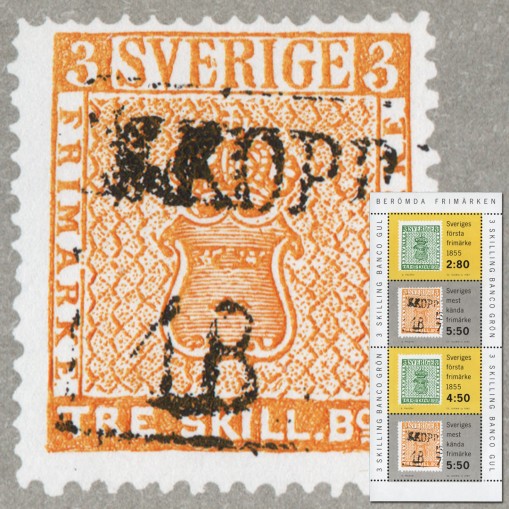Seria w bloku prezentująca słynne znaczki szwedzkie.