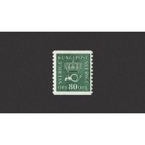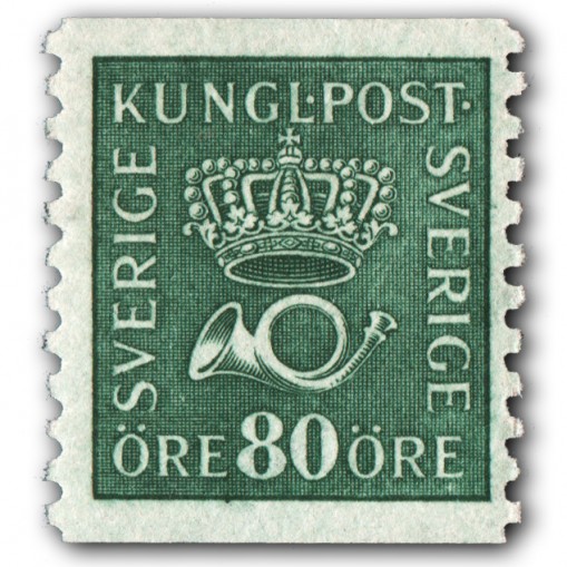 Znaczek obiegowy, na którym przedstawiono trąbkę pocztową i koronę.