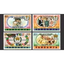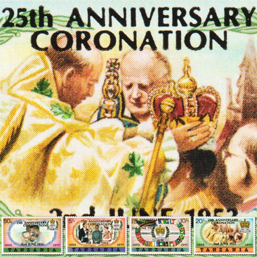 Na znaczkach widnieją kolejno: książę Filip i prezydent Nyerere, prezydent i para królewska, logo obchodów jubileuszu i flagi krajów Wspólnota Narodów (ang. Commonwealth) oraz ceremonia koronacji Elżbiety II.