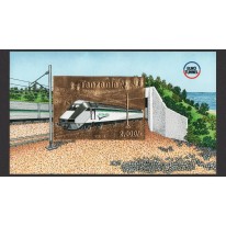 Znaczek w bloku upamiętniający otwarcie tunelu kolejowego pod Kanałem La Manche. Na znaczku widnieje lokomotywa pociągu wyjeżdżającego z tunelu.