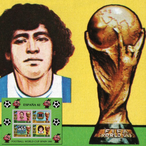 Na znaczkach widnieją piłkarze Jella Mtagwa i Diego Maradona, stadion i puchar.