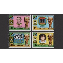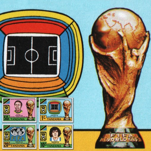 Na znaczkach widnieją piłkarze Jella Mtagwa i Diego Maradona, stadion i puchar.