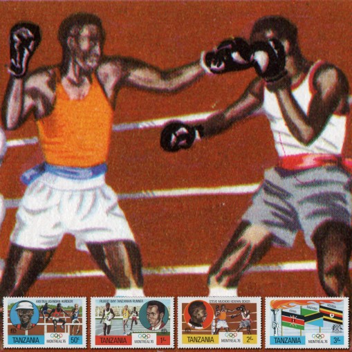 Na znaczkach widnieją sportowcy: Akii Bua w biegu przez płotki, biegacz długodystansowy Filbert Bayi i bokser Steve Muchoki, a także flagi Kenii, Tanzanii i Ugandy.