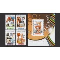 Na znaczkach widnieją kolejno: piłka nożna, kolarstwo, szermierka, piłka siatkowa i gimnastyka.
