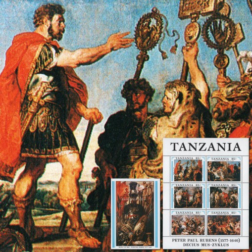 Na znaczkach widnieją fragmenty cyklu przedstawiającego historię rzymskiego publiusza Decjusza Musa.