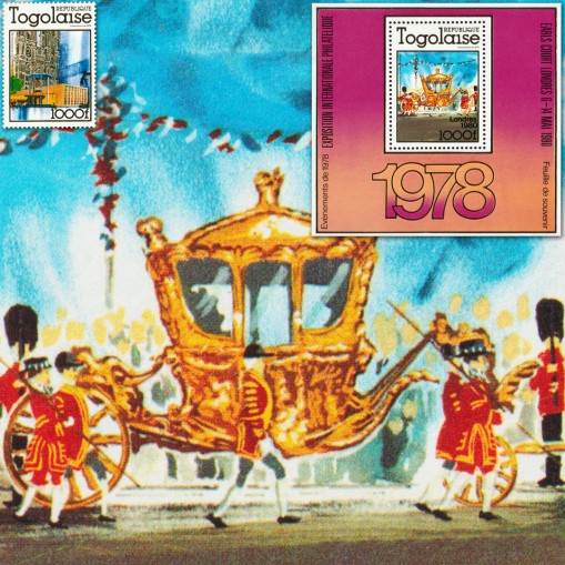 Na znaczkach przedstawiono Opactwo Westminsterskie oraz karetę królewską.