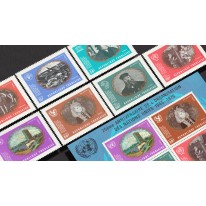 Na znaczkach widnieją loga ONZ oraz poszczególnych organizacji ONZ i reprodukcje obrazów, które symbolizują zadania tych organizacji, kolejno: