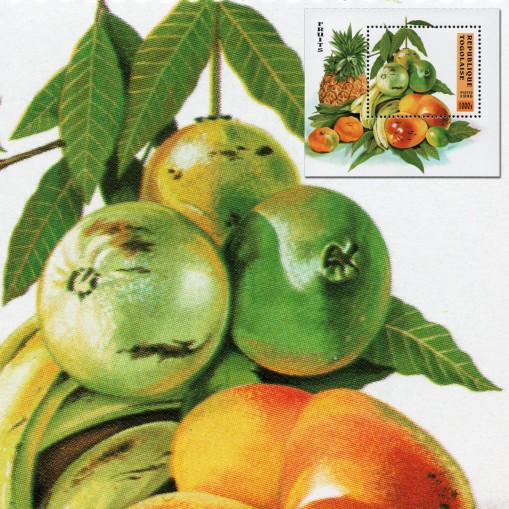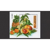 Znaczek w bloku, na którym widnieją owoce tropikalne.