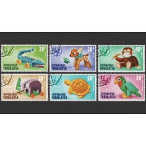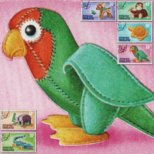 Na znaczkach widnieją zabawki dziecięce: drewniany krokodyl, jelonek Bambi i motyl, małpka, drewniany słoń, żółw i papuga.