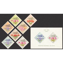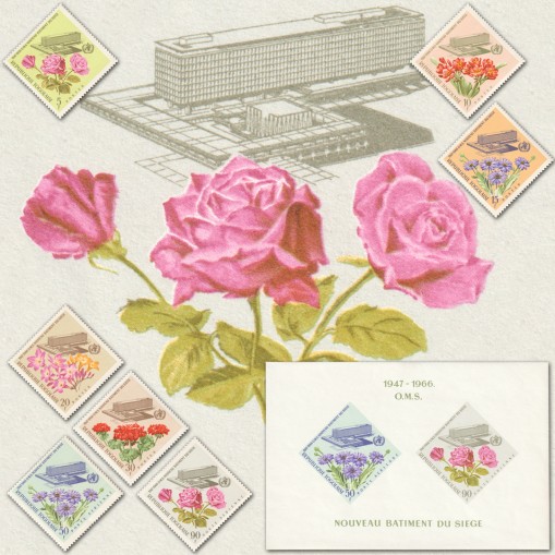 Znaczki upamiętniające otwarcie kwatery głównej Światowej Organizacji Zdrowia (WHO) w Genewie. Na znaczkach przedstawiono budynek i różne gatunki kwiatów: róże, astry, bodziszki, frezje, alstremerie.