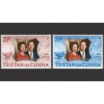 Na walorach przedstawiono portrety pary królewskiej obok sieweczki i atolówki (znanej także jako rybitwa biała) - gatunków charakterystycznych dla Tristan da Cunha.