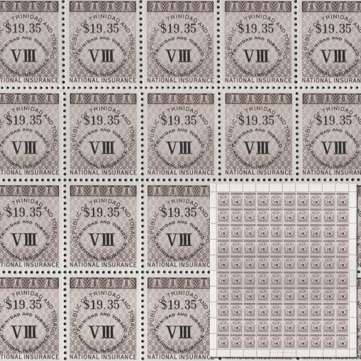 Znaczki służące jako opłata za ubezpieczenie narodowe w Trynidadzie i Tobago. Znaczki takie drukowano od lat 1970. Każdy nominał posiada oznaczenie cyfrą rzymską od I do VIII.