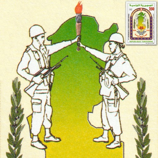Znaczek upamiętniający 50. rocznicę utworzenia armii tunezyjskiej. Na znaczku widnieją żołnierze z pochodnią na tle mapy kraju.