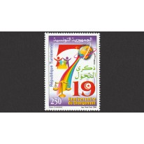 Znaczek celebrujący 19. rocznicę bezkrwawego przewrotu dokonanego 7 listopada 1987 roku przez ówczesnego premiera Zajn al-Abidin ibn Ali, za pomocą orzeczenia lekarskiego o niezdolności prezydenta Bourguiby do sprawowania urzędu. Zgodnie z ówczesną tunezyjską konstytucją automatycznie przejął on obowiązki głowy państwa.